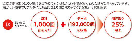 2023年11月にSignia IXがリリースしました。シグニア最新補聴器「SigniaIX」の最大の特徴はロックオン機能です。ロックオンとは、複数の相手を追いかけ、会話の言葉のすみずみまでより正確に再現する機能。この機能により、聞き取りが※最大25%向上したというデータもあります。※騒音下ロックオン機能有無で比較した場合。