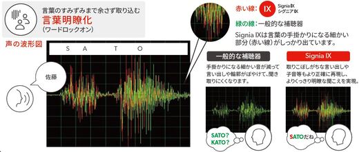 Signia IXのロックオン機能は、「言葉明瞭化(ワードロックオン)」と「会話補足(スピーチロックオン)」の二つで構成されています。言葉明瞭化(ワードロックオン)とは、子音を正確に再現する機能です。