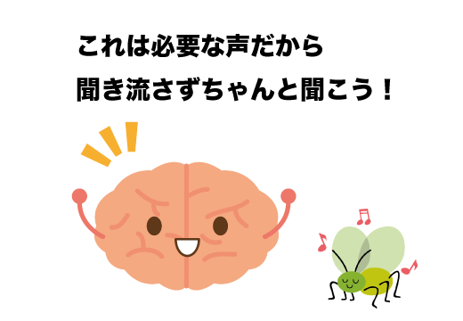 実際に、教授と1週間同行したキューバ人の男性は3日目で虫の声を聞き取ることができました。 このように私たちは無意識で聞きたい音を選んでいるのです。そして、このような音の選択は日常的に行われています。カクテルパーティー効果はご存知でしょうか?