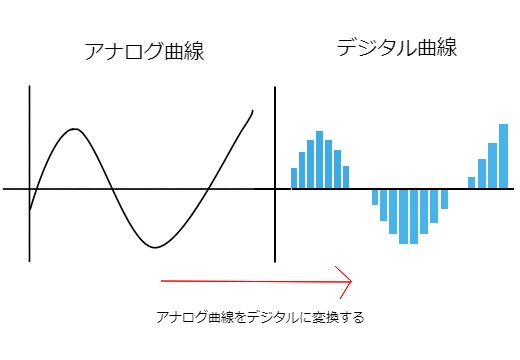A/D変換器でアナログデータをデジタルデータに変換します。次にデータを渡すプロセッサは、デジタルデータでしかデータを扱えないためです。アナログデータを一定時間ごとに切り取りデジタルデータに変換します。