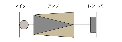 マイクから運ばれた電気信号はアンプによって増幅します。アンプは入力された電気信号を、事前に設定された増幅量に応じて大きくします。