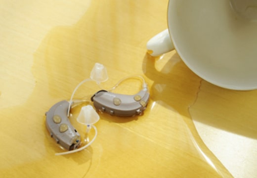 最近では補聴器の表面や内部に水分をはじくコーティングがされている補聴器もあります。また乾燥・消毒ができる補聴器の保管ケースも販売されています。それらであっても完全に水分を防ぐわけではありませんので、常日頃から水分・湿気から守るように心掛けが大切です。